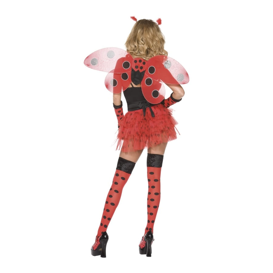 Déguisement de coccinelle sexy, pour femme, composé d'un corset noir et rouge à pois noirs, d'un tutu rouge, d'ailes rouges à pois noirs, d'un collier noir, de collants rouges à pois noirs, de gants et d'un serre-tête assortis. Il vous sera possible de choisir la taille XS, S, M ou L lors de la commande. Déguisez-vous en insecte sexy lors d'un enterrement de vie de garçon ou de jeune fille!