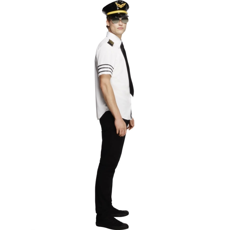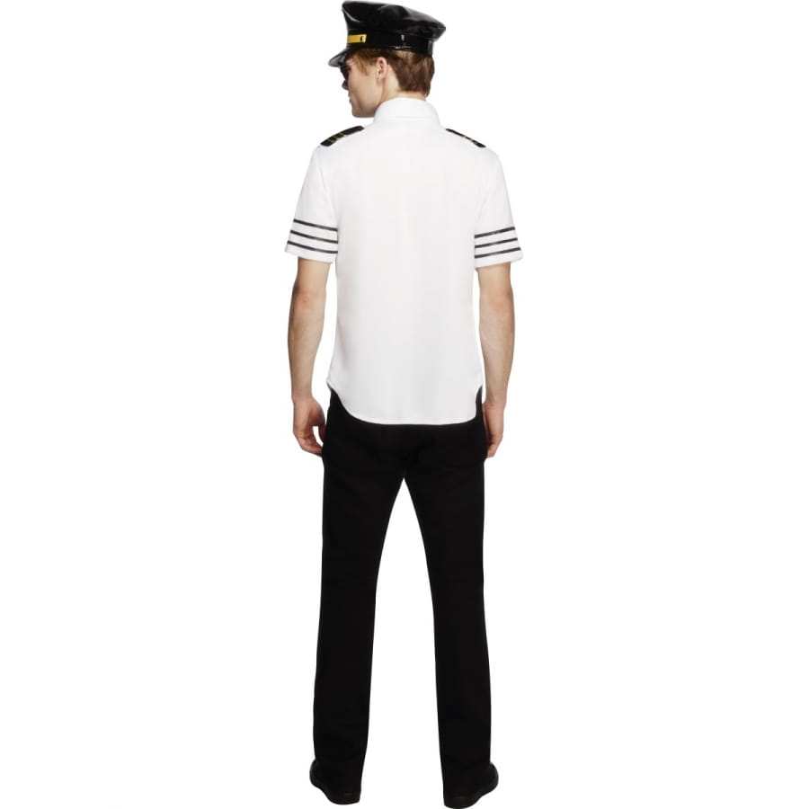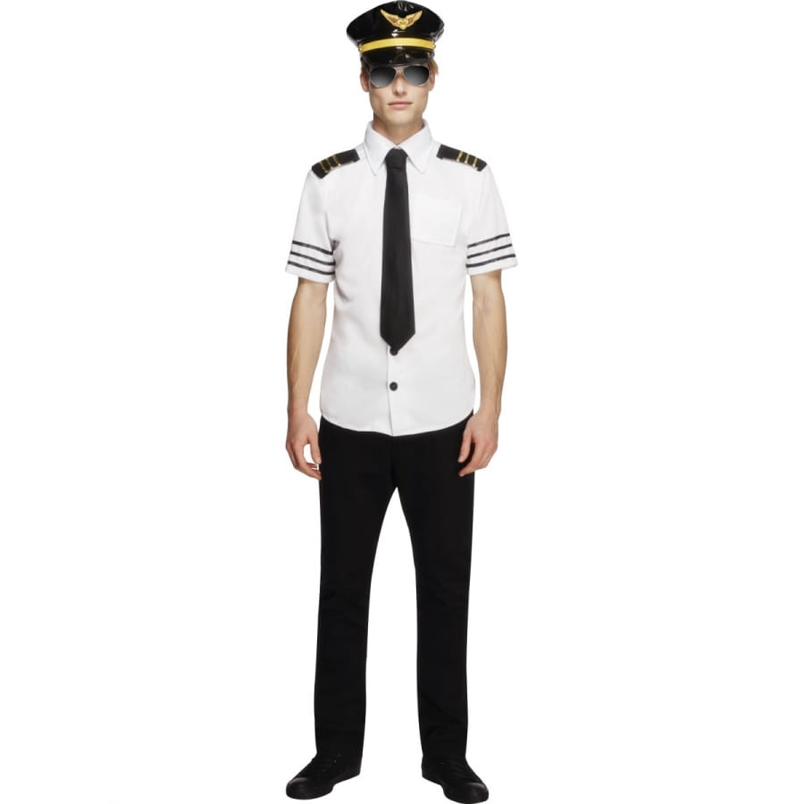 Déguisement de commandant d'avion, pour homme, composé d'un chapeau noir et jaune, d'un haut noir et blanc et d'une cravate noire. Choisissez entre une taille S, M ou L au moment de la commande. Cet ensemble vous donnera un air très sexy et est idéal pour un enterrement de vie de jeune fille.
