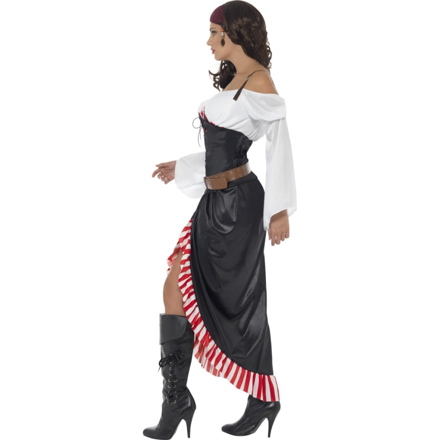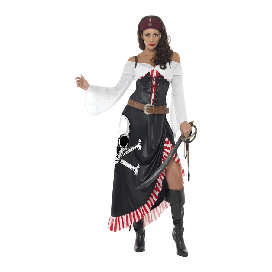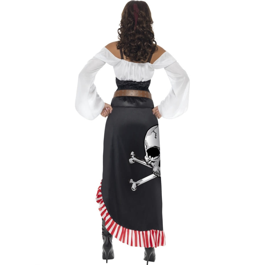 Déguisement de corsaire, pour femme, composé d'une robe et d'une ceinture marron. La robe est à manches longues, de couleur blanche, noire et rouge. Elle est imprimée de rayures et d'une énorme tête de mort. Elle suffira amplement à faire de vous une vraie pirate à l'occasion d'une fête déguisée.