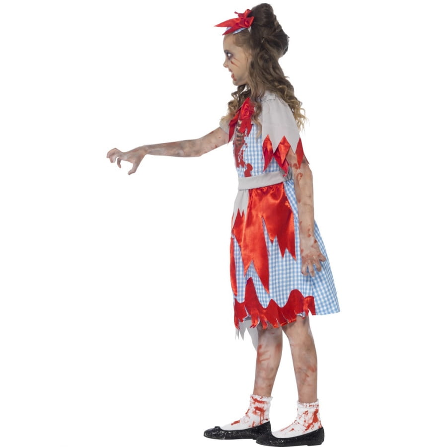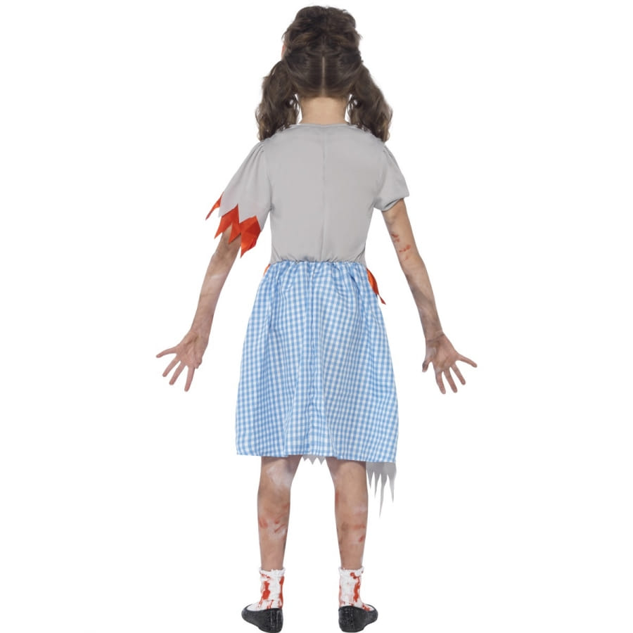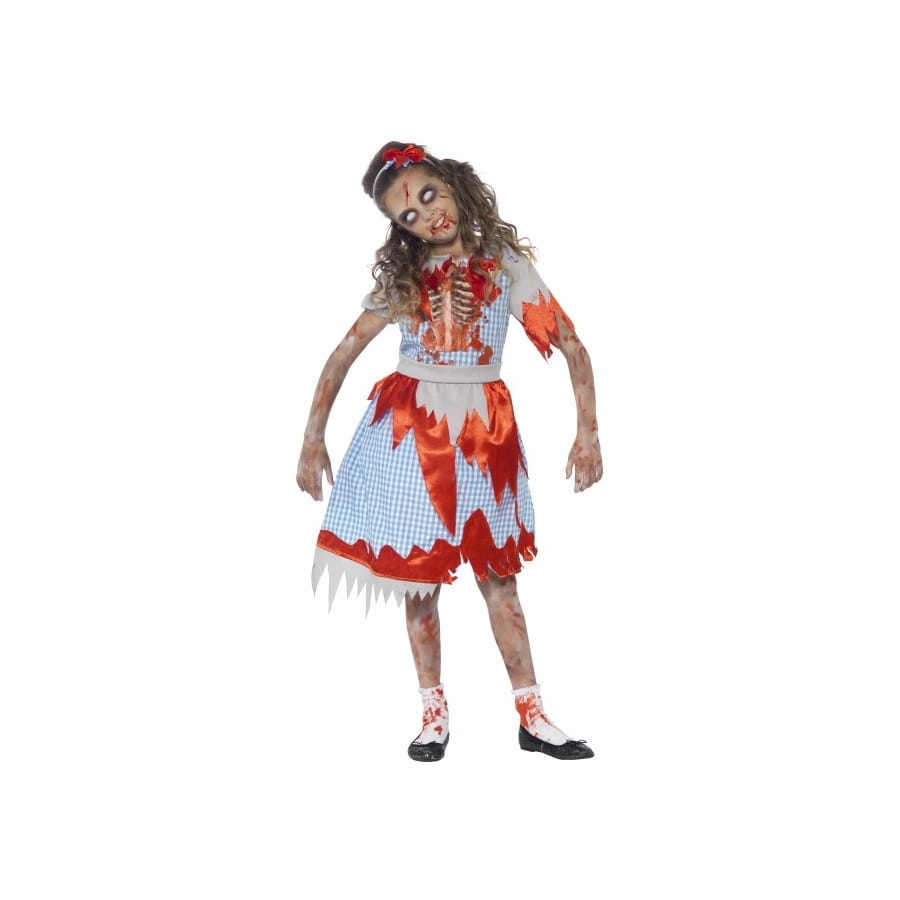 Nous avons combiné dans un même déguisement deux personnages très intéressants : un zombie et une chanteuse de country, ce qui a donné le déguisement country zombie pour fillette. Ce déguisement regroupe une robe avec des petits carreaux de couleur bleue et blanche munie d'ornements en lambeaux de couleur rouge et de taches de sang. La robe imprimée est proposée pour les petites filles de 7 à 9 ans et de 4 à 6 ans, et est dotée d'une partie déchirée, à travers laquelle vous verrez des organes qui sont habituellement à l'intérieur de la poitrine, mais qui ne sont que des imprimés, ne vous inquiétez pas. Vous aurez également un serre-tête de couleur blanche décoré d'un noeud rouge.