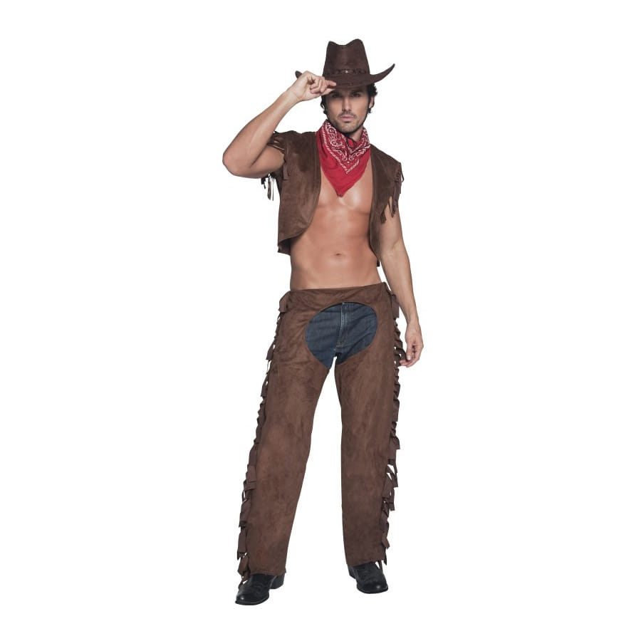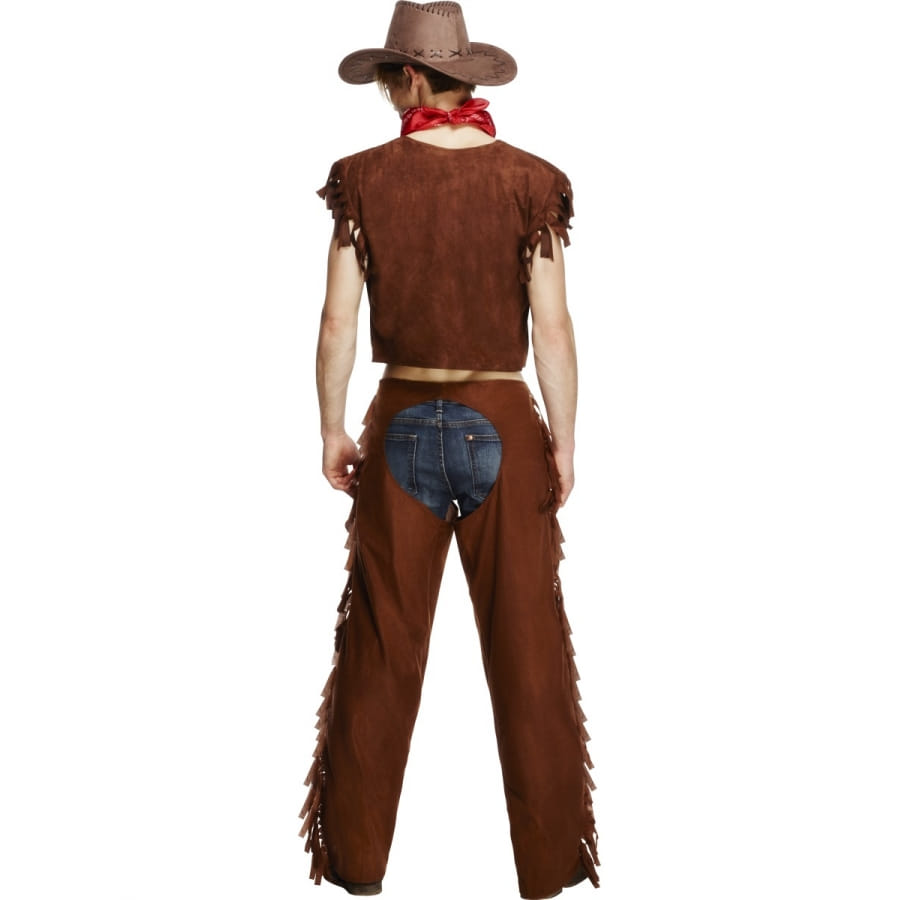 Déguisement de cowboy de couleur marron, pour homme, composé d'un gilet, de chaps et d'un foulard rouge. Ce déguisement peut être utilisé pour un look de star de cinéma, historique ou de western.