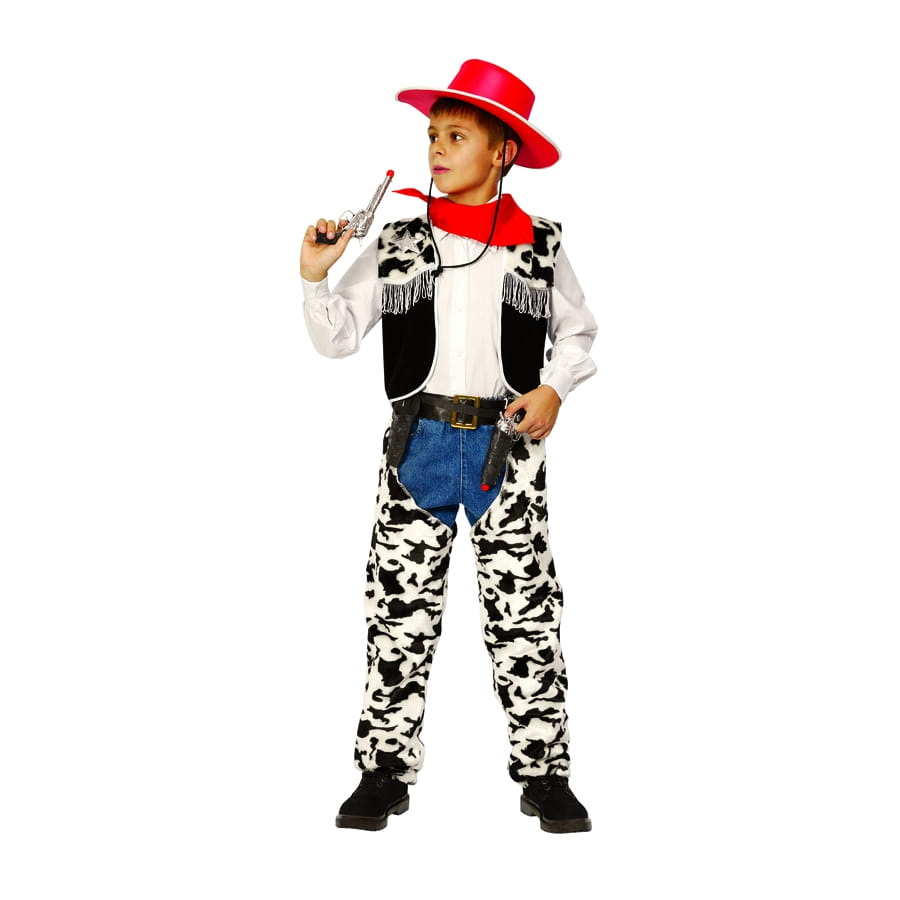 Les westerns ont toujours fasciné les petits et les grands. Faire un duel entre cowboys est toujours un jeu d'actualité chez les petits boutchous. Le déguisement cow-boy vachette pour enfant sera "vachement" apprécié ! Il s'agit d'une tenue spéciale pour petit garçon, composée d'une veste, d'un pantalon, d'une ceinture, d'un foulard et d'un chapeau. La veste et le pantalon sont de couleur assortie. Ils présentent un aspect tacheté noir et blanc, comme sur la robe d'une vache. La ceinture est noire, le foulard et le chapeau sont tous deux de couleur rouge. Un vrai petit cow-boy en herbe ne se déplacerait pas sans son arme. Plusieurs modèles sont mis à votre disposition sur happyfete.