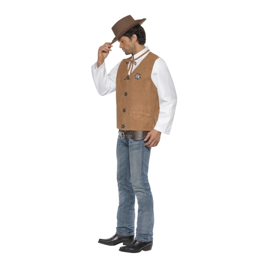 Déguisement de cowboy, pour homme, composé d'une chemise blanche, d'un veston marron, d'un badge argenté, d'une ceinture et d'une cravate marron également. Le tout est disponible en taille S, M ou L. Cet ensemble conviendra parfaitement à plusieurs thèmes tels que ceux d'aventure, de Western, de dessins animés ou d'Amérique.