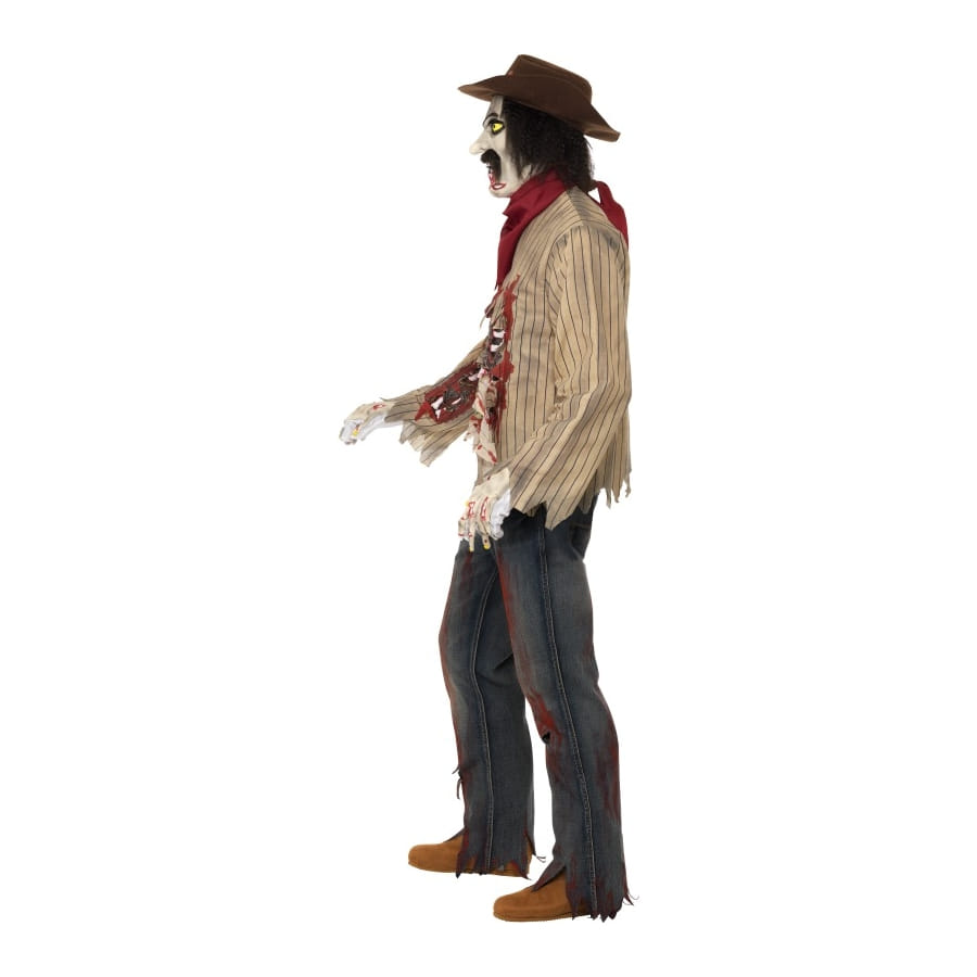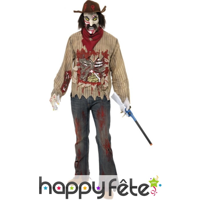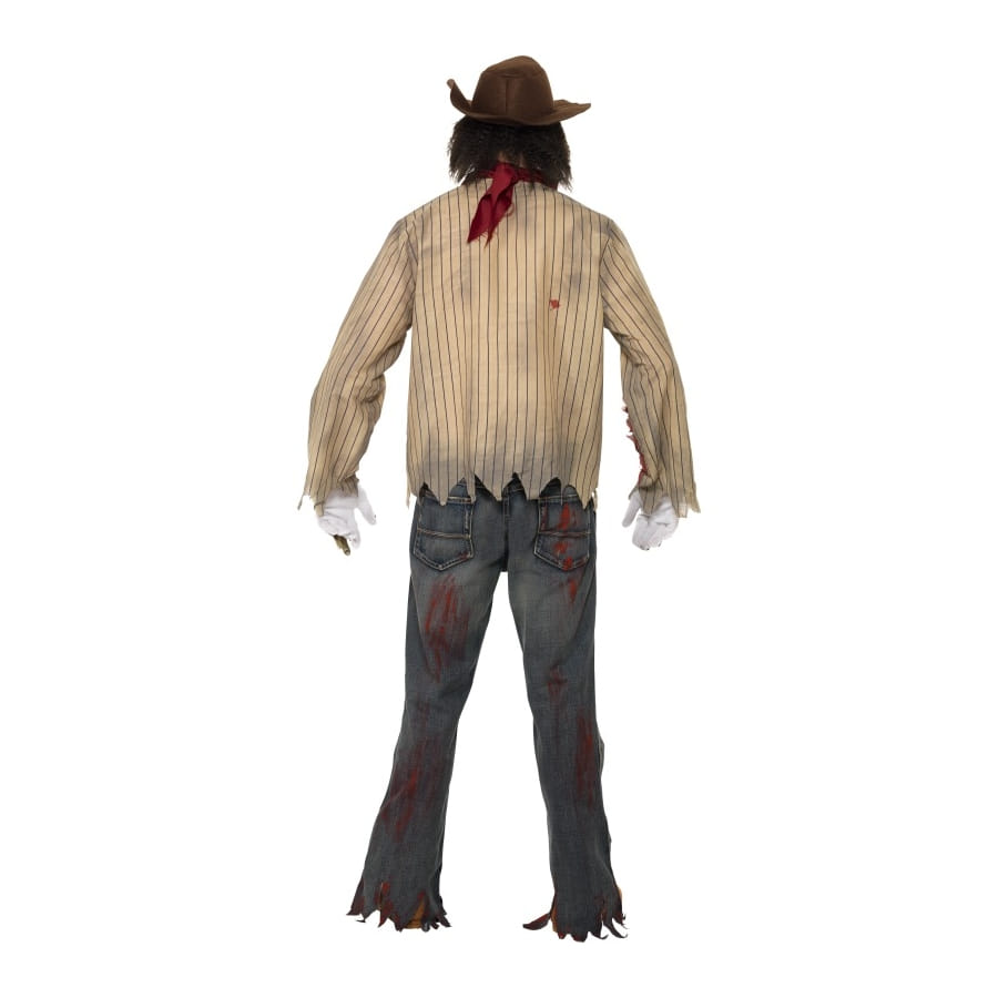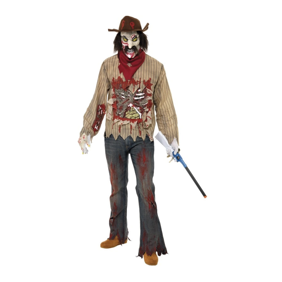 Déguisement de cowboy zombie, pour homme, composé d'un top, d'une écharpe rouge, d'un chapeau marron avec cheveux noirs, d'un masque de vieux cowboy mort-vivant furieux et de gants blancs. Le top est agrémenté de latex pour représenter un torse déchiqueté et le chapeau est criblé de balles ensanglantées. Ce déguisement est disponible en taille S, M ou L.
