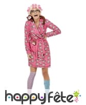 Le peignoir rose est imprimé de têtes de chats sur toute sa surface.