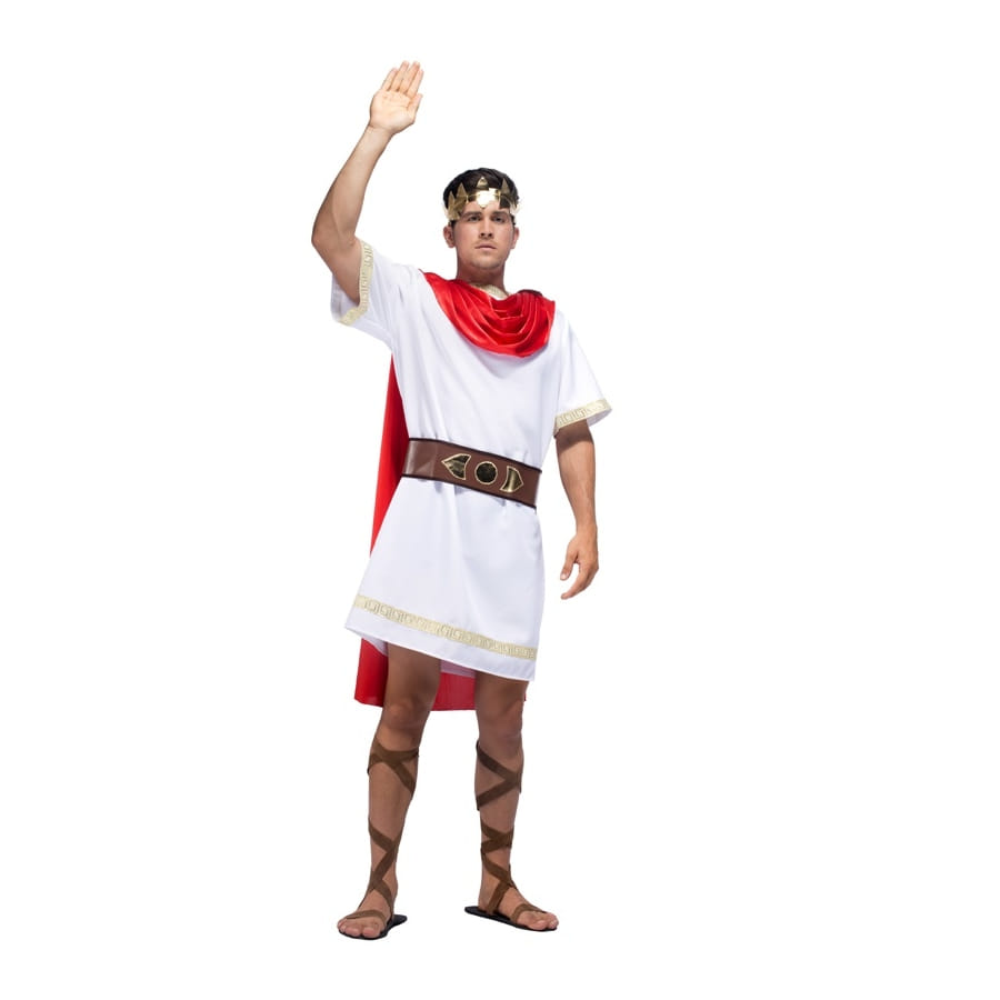 Pour un déguisement très réussi, il faut d'abord trouver un personnage intéressant qui vaille la peine d'être copié. Et plus le personnage choisi est connu, plus vous devriez vous concentrer sur les détails afin de l'incarner au mieux, car le résultat final fait tout l'intérêt du fait de se déguiser. Pour vous les hommes, nous avons sélectionné ce déguisement de césar pour homme afin que vous puissiez vous approprier le personnage du grand et puissant César. La tenue se compose d'une tunique blanche à manches courtes ornées de motifs marron, d'une cape rouge, d'une ceinture marron et d'une couronne de laurier dorée. Les jambières sur la photo ne sont pas comprises dans le lot.