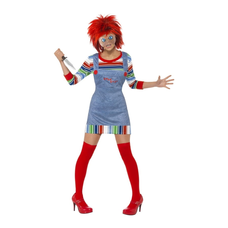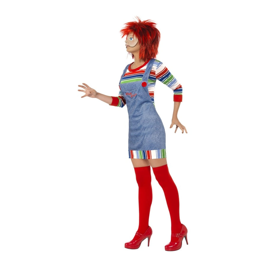 Déguisement de Chucky, pour femme, composé d'un pull à rayures, d'une salopette bleue, d'un masque de Chucky et d'une perruque rouge. Le pull et le bas de la salopette sont de couleur bleue, blanche, verte et rouge. La salopette comporte deux boutons rouges. Le tout est disponible en taille XS, S, M, L ou X1. Transformez-vous en la version féminine de Chucky, la poupée tueuse.