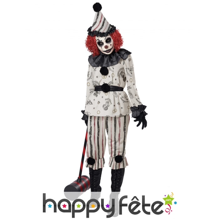 Le chapeau est un cône pointu avec un pompon noir au sommet et un froufrou noir à la base. Pour couronner ce costume, le masque du clown vous rendra aussi sinistre que possible, avec son visage blanc, ses sourcils froncés, ainsi que des orbites et des lèvres assombries.