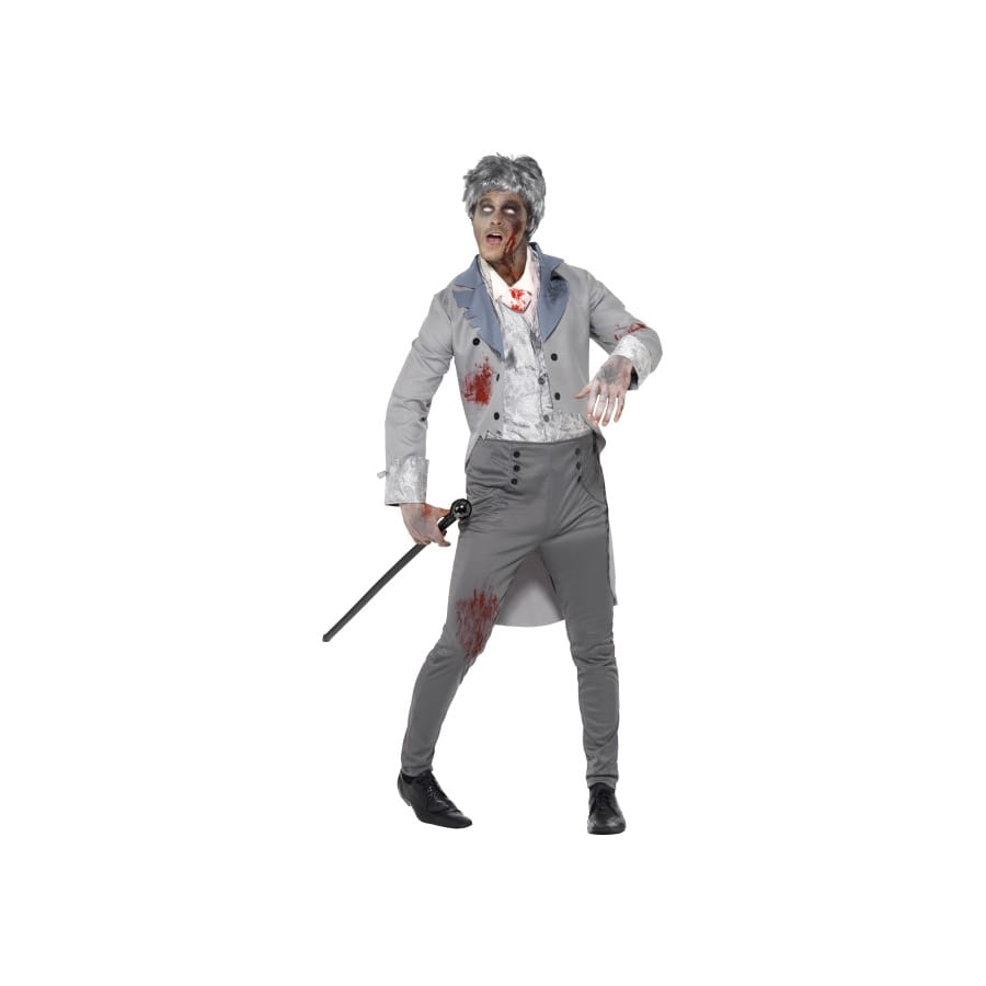 Pour hommes, voici un beau déguisement de comte ou de marquis zombie, parfait pour une soirée Halloween à thème "horreur", "magie et sorcellerie", etc... Pour terroriser les grands et les petits. Il se compose d'un pantalon, d'une veste queue-de-pie, d'une fausse chemise attachée avec une cravate. C'est un très beau costume, dommage qu'il soit très usé, sale et taché de sang, mais c'est évident, car il appartient à un zombie. Le tout est de couleur grise. Ce déguisement convient aux hommes en tailles L et M. Complétez-le avec une canne et une perruque, par exemple, sans oublier un maquillage de zombie, pâle à souhait, pour avoir l'air d'avoir perdu tout son sang. Joyeux Halloween !