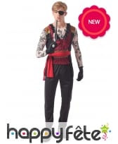 Fans de pirates et d'aventure, nous vous proposons ce déguisement de corsaire ligné pour adulte. Destiné aux hommes, ce costume comporte un t-shirt à rayures blanches et noires à col V, avec un faux gilet rouge sur le devant. Le déguisement est également composé d'un pantalon noir élastique à la taille, d'un bandana noir et d'un cache oeil noir pour accentuer le réalisme de l'ensemble. Au besoin, vous pouvez compléter la tenue avec une fausse barbe et une perruque ainsi qu'un sabre, comme sur la photo. Ces accessoires sont disponibles dans la section accessoires de notre site Happyfete. Ce déguisement conviendra parfaitement pour incarner un véritable corsaire lors de vos soirées déguisées, et des versions féminines sont aussi à voir pour ces dames.