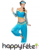 Les danseuses orientales attirent les regards dans leurs tenues qui font rêver. Lancez-vous dans la danse du ventre en commandant ce magnifique déguisement de danseuse orientale violet et blanc. Vous porterez un petit haut blanc qui laisse le ventre à l'air. Un faux gilet à manches courtes a été cousu par devant. Il est de couleur violet agrémenté de liserés dorés. Les manches du haut sont en voile blanc transparent, avec des extrémités à rayures multicolores. Le pantalon qui va avec la tenue est de couleur or et bronze, orné de quelques rayures colorées sur le devant. La coiffe présente également différentes bandes de couleurs en rayures verticales, agrémentées d'un léger voile blanc transparent.