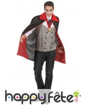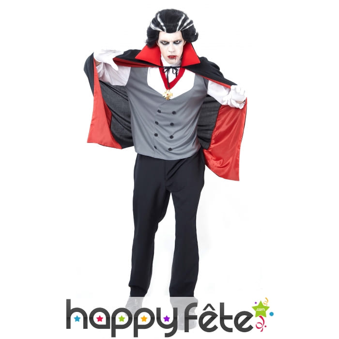 Vous voulez incarner le rôle de Dracula le temps de la fête des morts ? Nous avons le costume qu'il vous faut sur notre site. Il s'agit du déguisement de dracula avec cape rouge, adulte, que vous pouvez commander dès maintenant. Il est constitué d'une cape noire, fabriquée dans un tissu satiné assez fluide. Le revers de son col montant est de couleur rouge et elle s'attache grâce à deux petits rubans au niveau du cou. Le haut du costume se présente sous la forme d'une chemise blanche combinée à un gilet gris. Le déguisement de dracula avec cape rouge, adulte, contient également un bijou qui est un petit médaillon doré, suspendu à un cordon de couleur rouge.