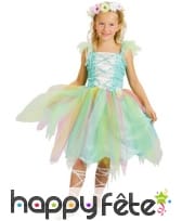 Faites vivre un conte de fée à votre enfant avec ce déguisement de fée multicolore pour fillette. Comme son nom l'indique, il s'agit d'un costume de fée, composé d'une robe avec un bustier en tissu molletonné vert menthe et blanc, et des bretelles de tulle vert et bleu. Quant au bas de la robe, elle est en tissu vert menthe recouvert de bandes de tulle vert, bleu et rose. Cette tenue se met très facilement car il suffit de l'enfiler comme un T-shirt. Le déguisement est également proposé avec une couronne en plastique, ornée de fleurs multicolores en tissu. Ce merveilleux déguisement sera idéal pour un carnaval ou un spectacle de danse.