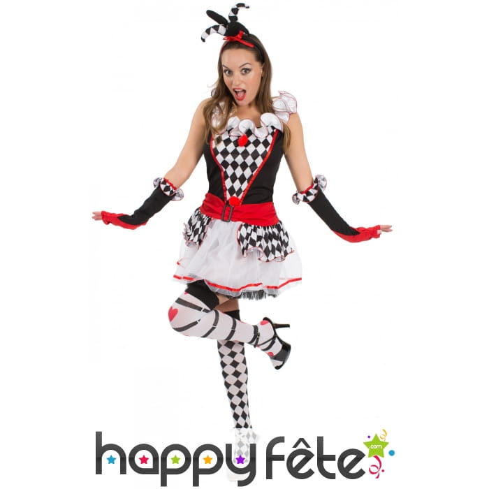 Grâce à sa robe courte à motif damier, cette tenue est fidèle à celle que revêt les arlequins.