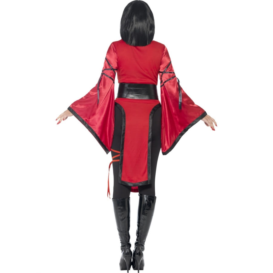 Si vous êtes une rebelle dans l'âme, et même plus que cela, un ninja dans l'âme, ce déguisement de femme ninja de l'ombre sera parfait pour vous. Composé d'une robe de couleur rouge de style kimono moderne, d'un leggings noir, d'une grosse ceinture de couleur noire, d'une paire de nunchaku et d'un masque de couleur noire qui cachera le bas de votre visage, ce déguisement est proposé en tailles L, M et S, rien que pour vous, Mesdames. Pour parfaire votre costume, rajoutez une belle paire de bottes et une perruque de cheveux raides comme ceux des Asiatiques, pour que le personnage soit crédible.