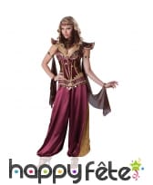 Plongez dans le monde merveilleux et féerique des milles et une nuit et des danseuses orientales avec ce déguisement de femme orientale rose flashy. Ce costume est composé d'un haut court rose foncé, avec une ceinture et un bandeau à voile blanche, le tout assorti. Il est également proposé avec un pantalon d'un rose beaucoup plus clair. Le côté élastique du pantalon lui permet de s'adapter à de nombreuses tailles. Cette tenue peut convenir à de nombreuses circonstances, aussi bien à une soirée déguisée, un carnaval ou un spectacle. Vos amis, qu'ils soient hommes ou femmes, apprécieront particulièrement l'aspect à la fois très féminin, décontracté mais aussi sexy de cette tenue.
