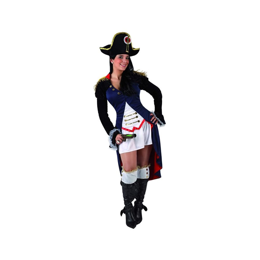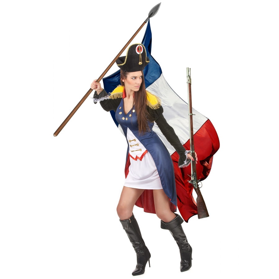 Ce déguisement de femme soldat grenadier, pour adulte, conviendra aux femmes de caractère. Il se compose d'une veste bleue longue à l'arrière allant jusqu'à la hauteur des creux poplités. La veste est décorée d'un faux boléro noir à col rouge, avec des manches longues. Elle est pourvue d'épaisses épaulettes à franges dorées et est agrémentée de faux boutons dorés autour du col à l'avant, avec un faux chemisier blanc à liseré rouge cousu sur le devant. Il y a ensuite la jupe blanche correspondante, de 38 cm de longueur, maintenue par un élastique à la taille, et le fameux chapeau bicorne en velours noir, épais, bordé d'un liseré doré. Il est orné sur le devant d'une fausse cocarde, et étant élastique, cet accessoire est adapté à tous les tours de tête. Une paire de cuissardes noires (non fournies ici) parfera votre costume.
