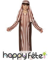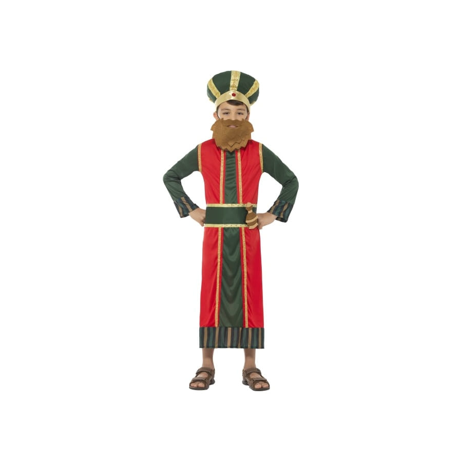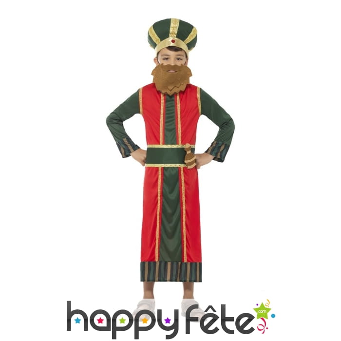 Rendre hommage au petit Jésus était important pour les rois mages. D'après l'histoire de la nativité, le roi Gaspar offrit du précieux encens à l'enfant roi. Grâce au déguisement de Gaspar pour enfant, votre petit garçon sera parfait dans une crèche de Noël animée. Le costume est formé par une longue robe combinant le rouge et le vert avec des liserés dorés. La robe est à manches longues, très agréable à porter. Une ceinture avec bouteille d'encens intégrée accompagne le vêtement. Au niveau des accessoires, vous trouverez un gros chapeau royal, vert et doré, ainsi qu'une barbe de couleur brune. L'ensemble est approprié aux petits garçons de 4 à 12 ans. Vous aurez plusieurs tailles au choix.