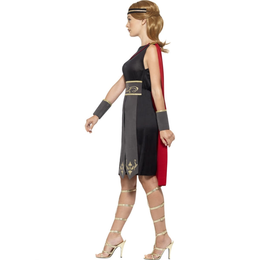 Une gladiatrice romaine, si cela avait existé, aurait été magnifique. Nous avons imaginé ce que cela pourrait donner et nous vous montrons le déguisement que nous en avons tiré : déguisement de gladiatrice romaine. Il est composé d'une jolie robe de couleur noire de style très romain avec ses ornements dorés, d'une cape attachée de couleur bordeaux, d'une paire de manchettes noire pour les bras et d'un serre-tête noir et doré. Vous n'aurez qu'à mettre de jolies spartiates avec pour compléter le tout. Ce déguisement, nous le proposons en L, M, S, XL et XS.