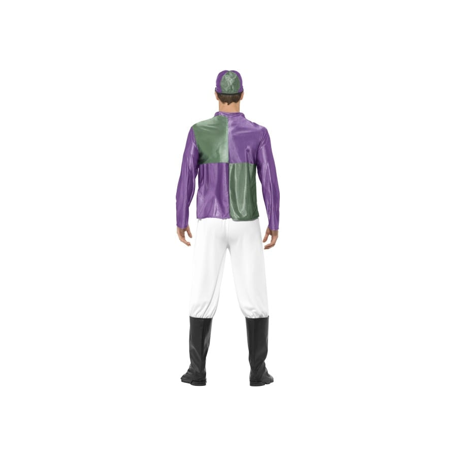 Au galop ! Que diriez-vous d'une leçon de relooking sur un métier équestre ? Appropriez-vous sans attendre le déguisement de jockey pour adulte. Cet ensemble complet est composé d'un pantalon classique de couleur blanche, accompagné d'un haut vert et violet avec fermeture éclair. Votre apparence de cavalier ne sera pas au point sans des couvre bottes de couleur noire. Côté chapeau, un modèle dans le style casquette, de la même couleur que le haut est mis à votre disposition. En guise d'accessoire, vous serez équipé d'une paire de lunettes de protection, de couleur noire. Ce déguisement est spécialement dédié à la gent masculine, à porter idéalement pour un enterrement de vie de célibataire.