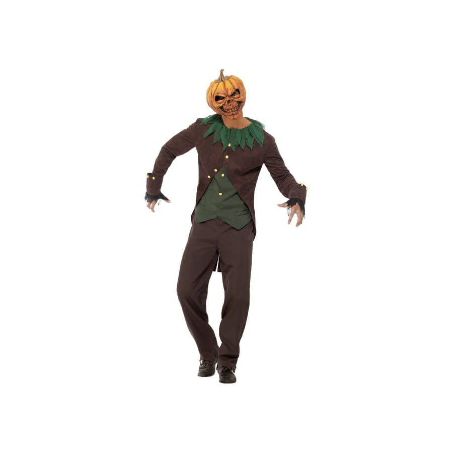 Des frissons à gogo le soir d'Halloween... Un monstre a été libéré de son livre. Faites honneur à un sinistre personnage avec ce déguisement de l'homme citrouille, chair de poule. Il est formé d'une veste, d'un gilet à manches longues ainsi que d'un long pantalon assorti. Les couleurs marron et vert sont au premier plan dans ce costume inspiré du film Chair de poule. Il est fourni avec un masque des plus exceptionnels qui représente l'effroyable tête de l'homme citrouille. De couleur orange, le masque recouvre intégralement le visage. Cet ensemble réservé à la gent masculine est quasi complet. Il vous offre l'opportunité de ranimer une histoire épouvantable pour un Halloween à marquer dans les annales !