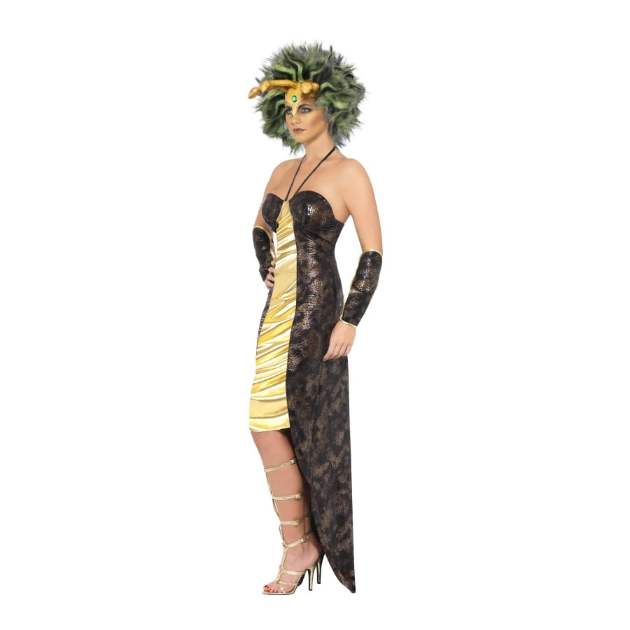 Déguisement de Médusa, pour femme, composé d'une robe dorée et marron, de protège-poignets marrons et d'une perruque agrémentée de serpents en latex. La robe est disponible en taille S, M ou L. Habillez-vous en monstre de l'Antiquité pour une fête historique. Quiconque vous regardera se transformera en pierre!