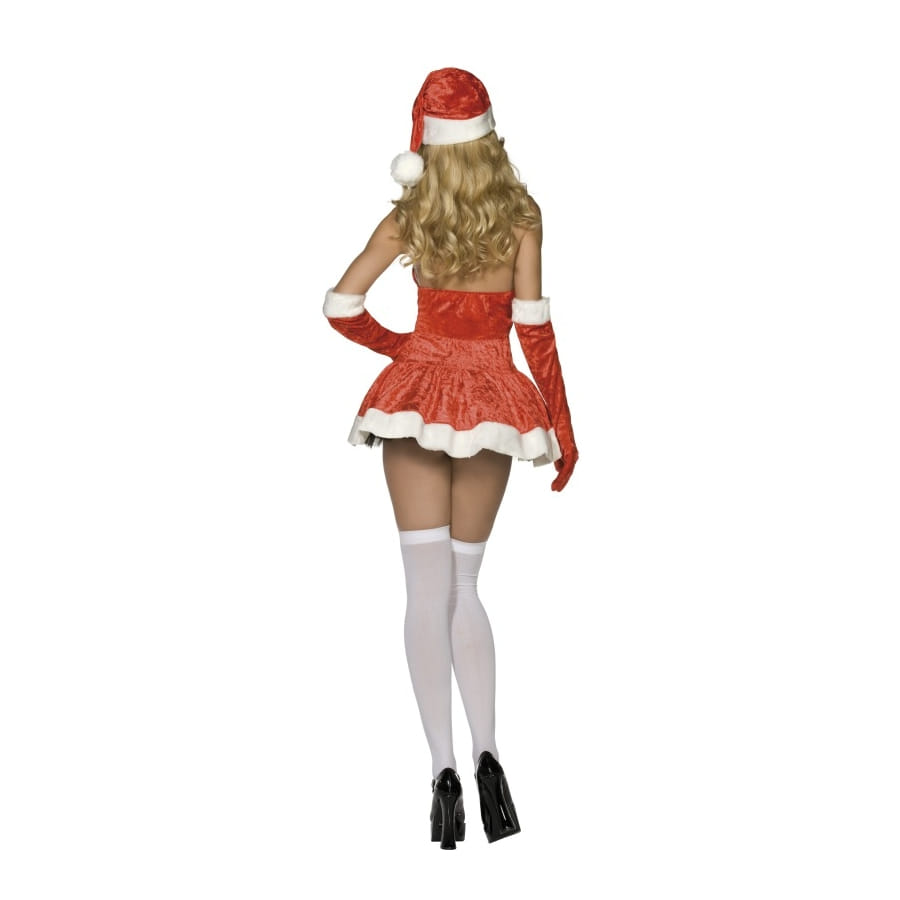 Déguisement "Fever" de Miss Santa pour femme. Cet ensemble est composé d'une mini-robe en velours de couleur rouge, avec bord en marabout blanc, d'un chapeau assorti avec pompon et d'une paire de gants de 50 centimètres de long. La robe est disponible en taille S, M ou L. C'est sûr que Noël sera chaud cette année!