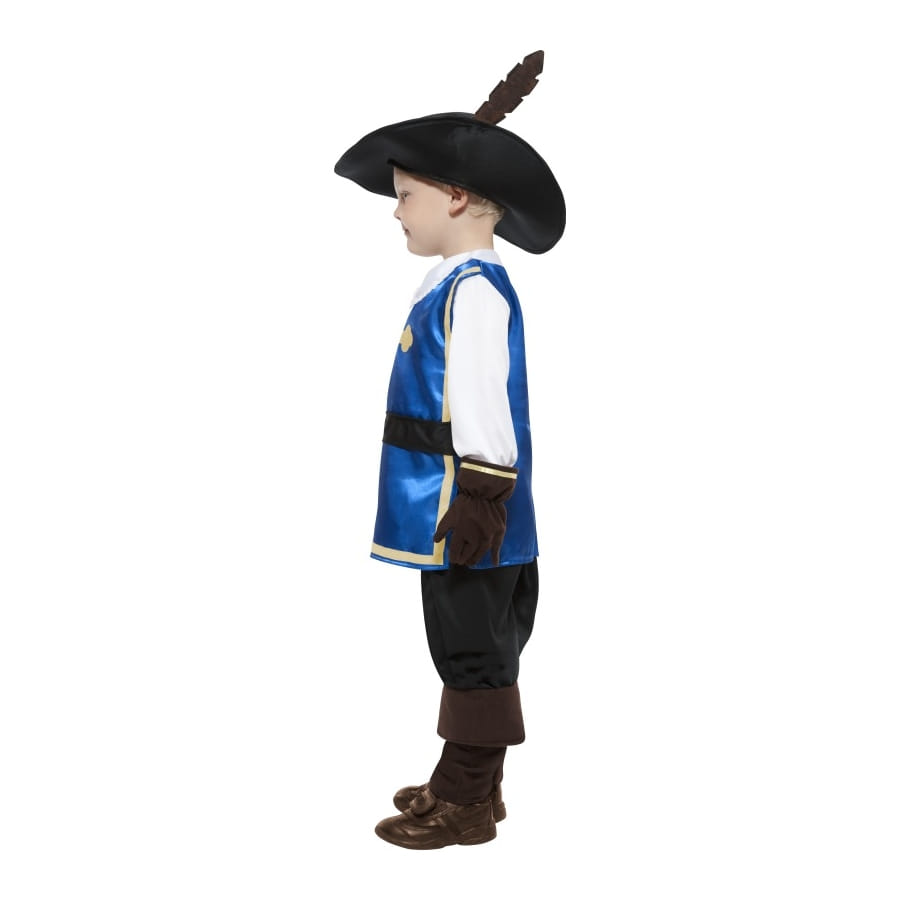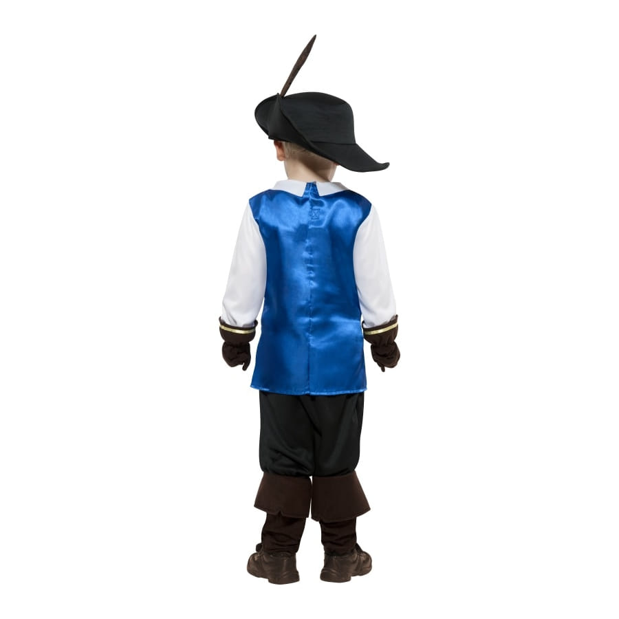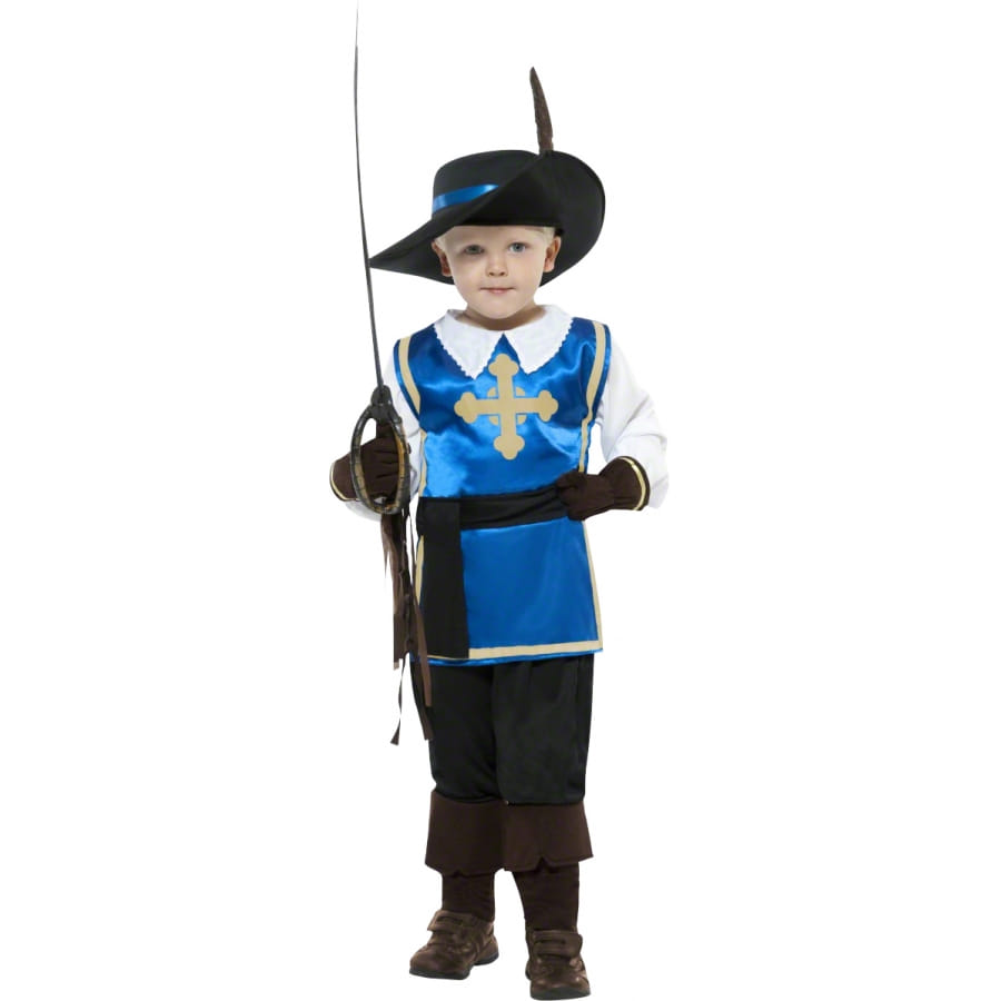 Costume de mousquetaire du roi 100% en polyester composé d'une tunique bleue imprimée d'une grosse croix argentée, d'un pantalon noir, d'une coiffe noire avec bande bleue et plume et d'une paire de gants assortie. Cet ensemble est disponible en tailles S, M et L. Votre enfant sera un vrai chevalier de la Table Ronde une fois ce déguisement enfilé!