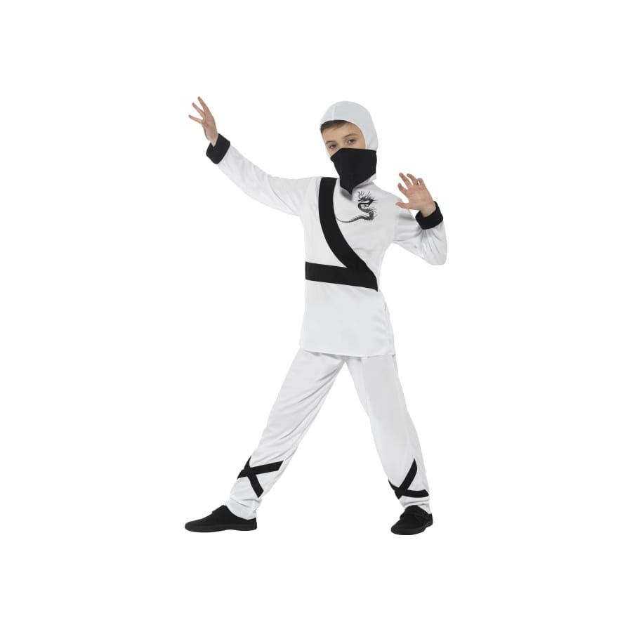 De l'agilité, de l'adresse, de l'ingéniosité, qui n'a jamais rêvé d'être un ninja ? Pour concrétiser cela, rien ne vaut ce déguisement de ninja blanc pour enfant. Celui-ci est dédié aux petits garçons qui aiment l'action et l'aventure. Il est composé d'un pantalon et d'un haut de couleur blanche, avec quelques touches de noir, ainsi qu'un motif dragon imprimé sur le devant. Il est primordial pour un ninja de se faire discret. C'est pourquoi la cagoule et le masque vous seront indispensables. Vous disposerez de modèles de couleur noire et blanche, parfaitement assortis à la tenue. Vous n'aurez plus qu'à puiser des armes de ninja dans la section accessoire du site happyfete.