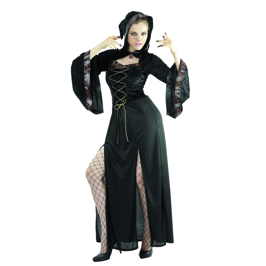 Mesdames, pour la fête des morts, soyez la plus séduisante en adoptant un look gothique. Vous allierez ainsi le charme d'une belle tenue et le côté macabre d'halloween. Pour ce faire, nous vous proposons le déguisement de pèlerine gothique. Cet article, reste disponible sur notre site. Il ressemble à une longue robe à capuche, taillée dans un tissu noir assez léger. Elle présente deux fentes sur de chaque côté et la capuche se ferme par velcro caché sous un bijou. Elle comprend aussi un bustier fait de tissu à l'aspect de velours. Sous forme de corsage, il est décoré d'un laçage en fil doré. Quant aux bordures du col et des manches longues évasées, leurs lisérés ont des imprimés en toile d'araignées.