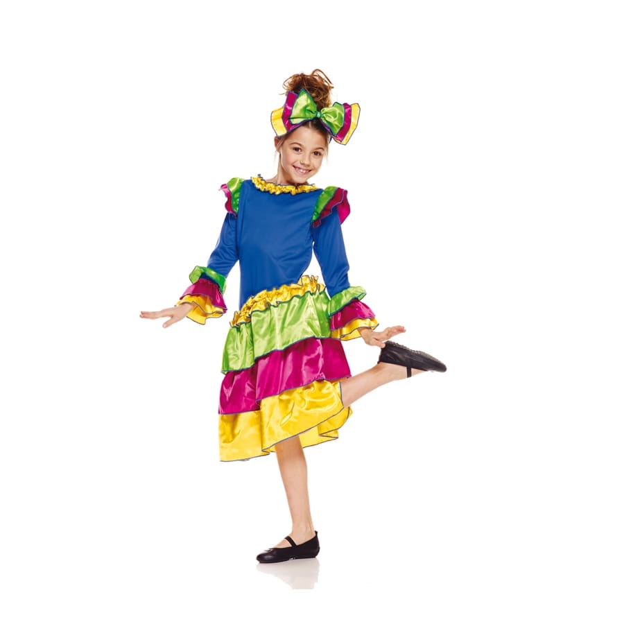 Profitez de la fête de la musique pour faire découvrir une nouvelle culture à vos enfants ! Les petites filles sont invitées à expérimenter les rythmes envoûtants et les mélodies nostalgiques du Brésil à travers le déguisement de petite brésilienne folklorique. Votre fillette sera comme dans la peau d'une danseuse brésilienne dans sa magnifique robe multicolore. Il s'agit d'une robe à volants, équipée de longues manches, et fabriquée dans un tissu satiné très agréable à porter. Retrouvez les couleurs bleu, vert, jaune et rose combinées sur le même vêtement. Un bandeau de couleur assortie complète le costume. Il prend la forme d'un gros noeud papillon ultra coloré. Différentes tailles sont proposées pour cet article, pour les 5 à 11 ans.