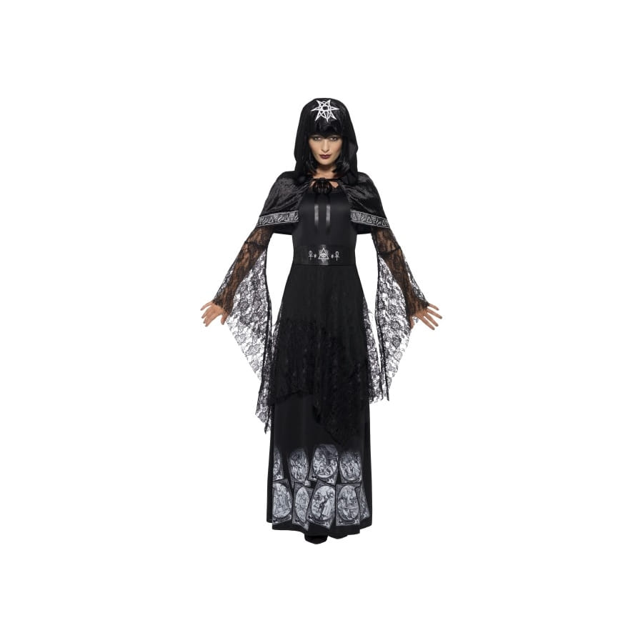 Impressionnez votre entourage avec ce déguisement de prêtresse occulte noir inégalé ! L'ensemble est composé d'une robe très longue de couleur noire, avec des motifs blancs, accessoirisée par une petite cape à nouer sur le cou et une ceinture, le tout parfaitement assorti. Les manches de la robe sont longues et évasées, élaborées dans une fine dentelle. Ce costume sera un déguisement idéal pour se mettre dans la peau d'une véritable prêtresse sinistre le temps d'une soirée Halloween ou d'un bal costumé. Pour un rendu plus spectaculaire, nous vous conseillons de compléter cette tenue avec une perruque noire ainsi que du maquillage, à retrouver dans la section Cosmétique du site.