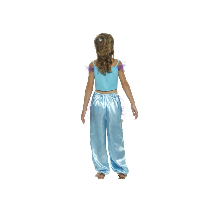 Un rêve qui vire à la réalité, c'est lorsqu'une petite fille se transforme en princesse de conte de fée. Constituez une épopée à l'orientale en vous munissant de ce déguisement de princesse arabe pour enfant. Votre enfant pourra devenir une héroïne des mille et une nuits dans ce magnifique costume de couleur bleue. Il est composé d'un petit haut sans manches orné d'un léger voile bleu transparent au niveau de la poitrine et d'une fine ligne dorée. Le pantalon est également doté d'un voile et d'une dorure au niveau de la taille. Le bandeau est décoré d'une fausse pierre bleue en forme de coeur. Les tailles proposées conviennent aux petites filles de 4 à 12 ans.