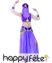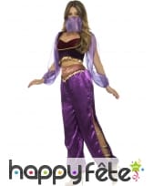 Incarnez une belle princesse sans avoir à enfiler une robe. Inspiré des mille et une nuits, ce déguisement de princesse arabe pour femme est idéal pour se faire remarquer lors d'un bal costumé. Vous disposerez d'un pantalon violet et d'un petit haut assorti, avec quelques petites dorures qui pendent au niveau de la taille et du ventre. Les manches sont longues mais d'un tissu voilé. Elles laissent entrevoir une partie des bras. Un petit voile violet destiné à cacher le bas du visage est également fourni. Vous aurez le look d'une danseuse orientale qui va enflammer la piste de danse dans cette tenue. Ecrivez votre propre conte de fée en une soirée !