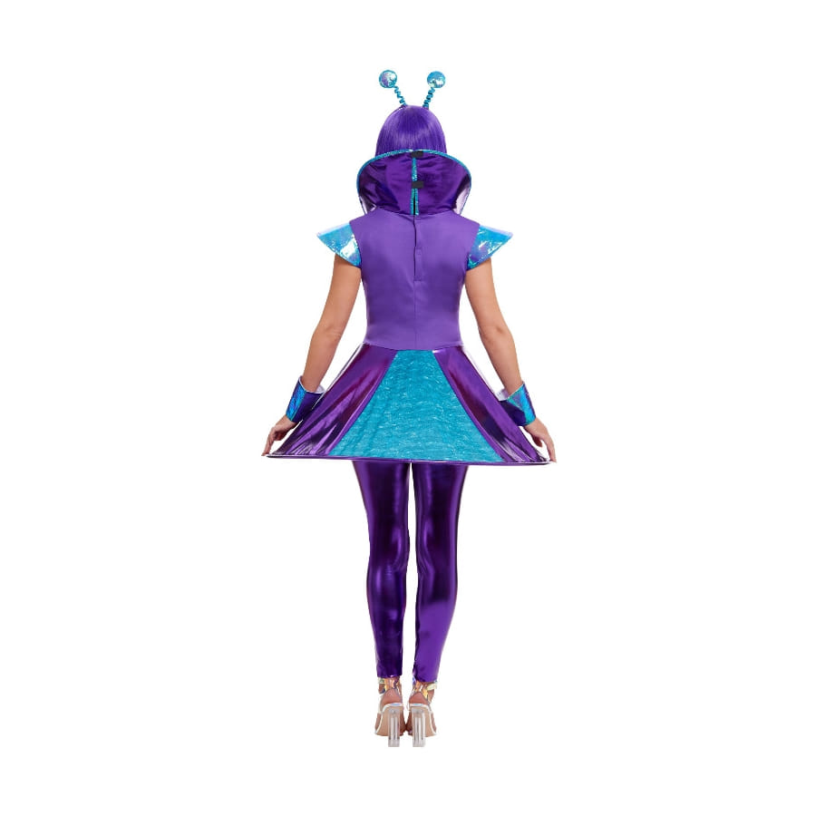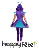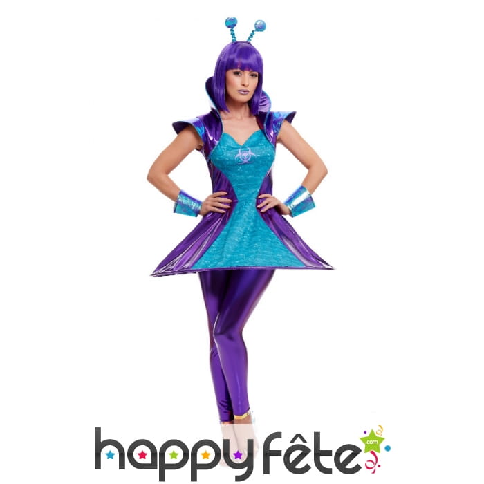 La robe est bicolore (bleue et violet) et porte un petit symbole alien sur le buste.