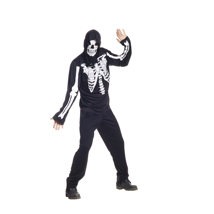Messieurs, pas besoin de vous prendre la tête sur ce que vous porterez à Halloween. Les frissons sont au rendez-vous dans ce déguisement de squelette imprimé pour adulte. Le costume comprend un tee shirt et une cagoule pour former une tenue cool et sympa, mais terrifiante à souhait. Le tee shirt est de couleur noire avec des motifs torse et bras de squelette imprimés en blanc. Il est doté de longues manches. Quant à la cagoule, elle est noire avec une tête de squelette imprimée sur le devant. Comme sur la photo, il est préférable d'accompagner ce déguisement d'un pantalon noir. Qui donc se cache sous la cagoule ? Vous allez créer des sensations fortes !