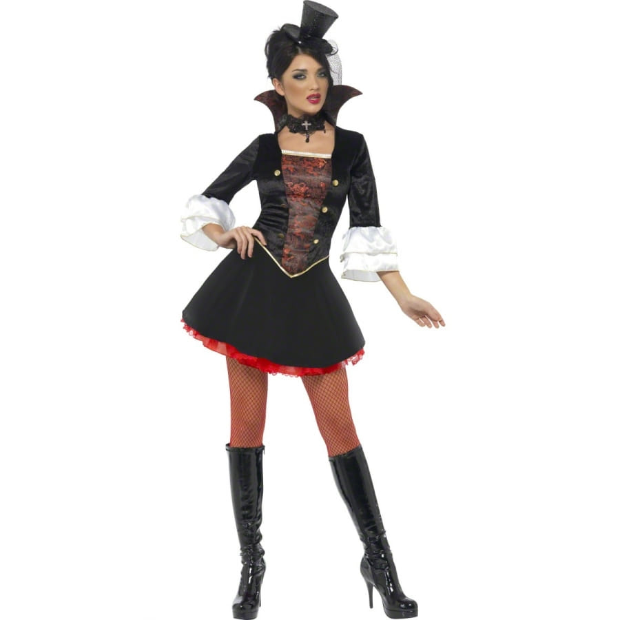 Costume Fever de vampire, pour femme, composé uniquement d'une mini-robe noire, blanche et rouge avec col intégré. La robe comporte des dessous en dentelle rouge, un haut en forme de corset et des manches blanches. Elle est disponible en taille XS, S ou M. Elle fera de vous une vampiresse ultra sexy pour une nuit d'Halloween mémorable.