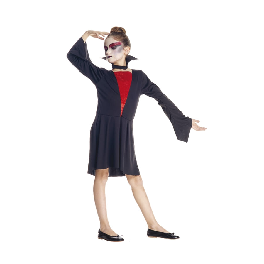 Les créatures légendaires remplissent les rues le soir d'Halloween. Votre petite fille aura le plaisir d'en incarner une, grâce au déguisement de vampire noir et rouge pour fillette. Ce costume authentique de vampire est constitué par une belle robe de couleur noire ornée d'une jolie touche de rouge sur le devant. Les manches sont longues avec une découpe évasée. Un petit col noir, bien relevé à l'arrière, est également fourni pour compléter le costume. Afin de fignoler le déguisement, optez pour un maquillage sombre, toujours dans les tons rouge et noir, ainsi que pour une coiffure relevée dans le but de mettre en évidence le petit col noir.