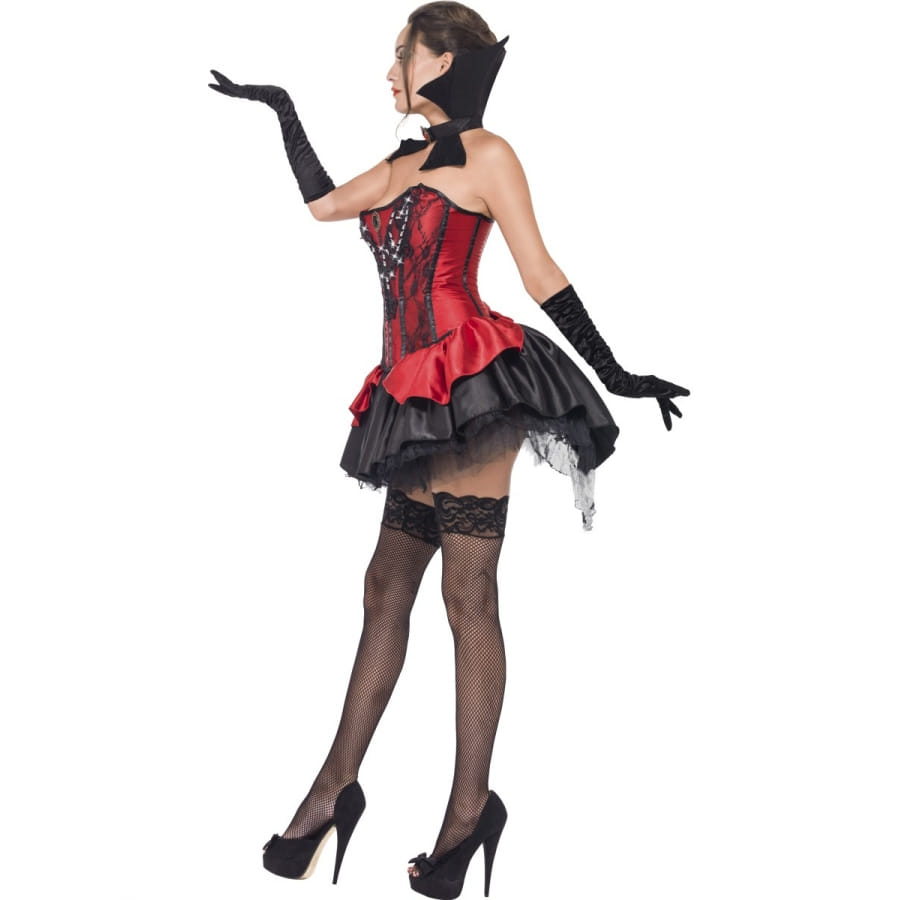 Les histoires de vampires? Vous adorez ça! Tout comme nous! Mais vous avez l'impression que l'accoutrement des vampires ne va pas très bien avec vos jolies formes, mesdames? Eh bien, nous avons pensé à vous en concevant ce costume. Vous pourriez être belle, en faisant peur en même temps, pour Halloween. Le déguisement est composé d'un corset qui épousera bien votre corps, ce corset est rouge sang, avec des petites décorations en dentelle noire, d'une jupe, rouge également sur les deux côtés et noire pour le reste, elle est garnie d'un voile noir à l'intérieur et d'un collier qui prend la forme des ailes d'une chauve-souris. Mettez le tout avec un collant noir et des escarpins noirs, et vous voilà prête pour une nuit ensanglantée. Les tailles disponibles sont: S : robe de taille 36-38, M avec une robe de taille 40-42, L correspondant à une robe de taille 44-46.