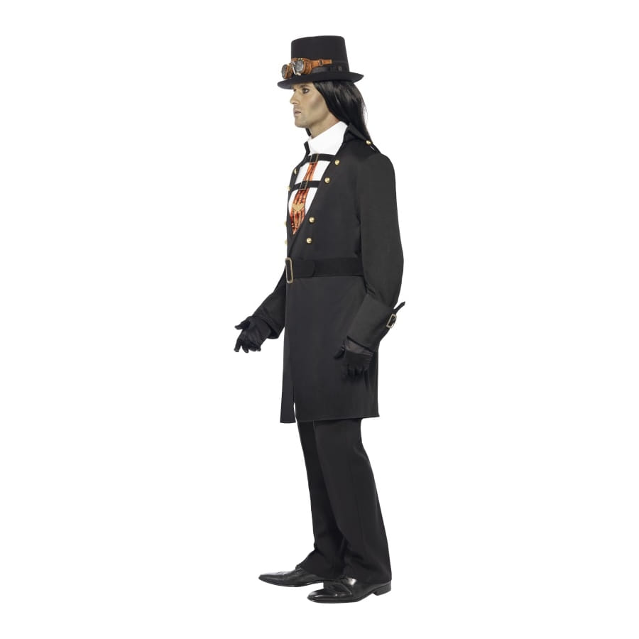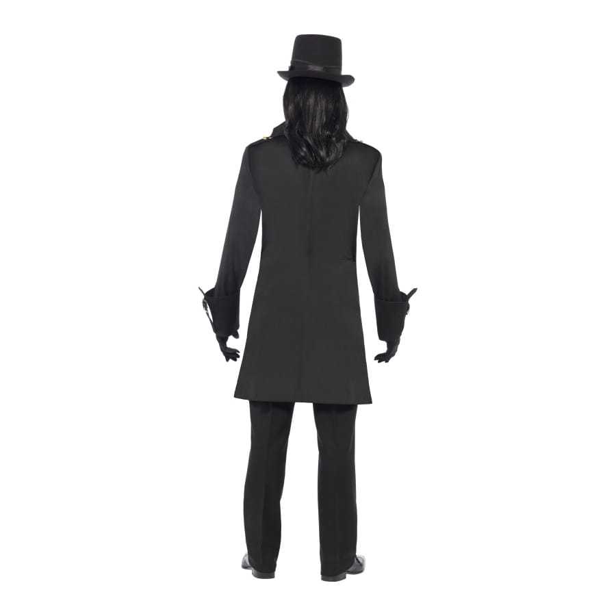 Set de déguisement de vampire victorien, pour homme, composé d'une veste noire avec chemise blanche attachée, d'une cravate rouge et noire et d'un badge doré. Le tout est disponible en taille S, M ou L au moment de la commande. Vous remarquerez que ce déguisement peut être utilisé pour un thème gothique ou steampunk.