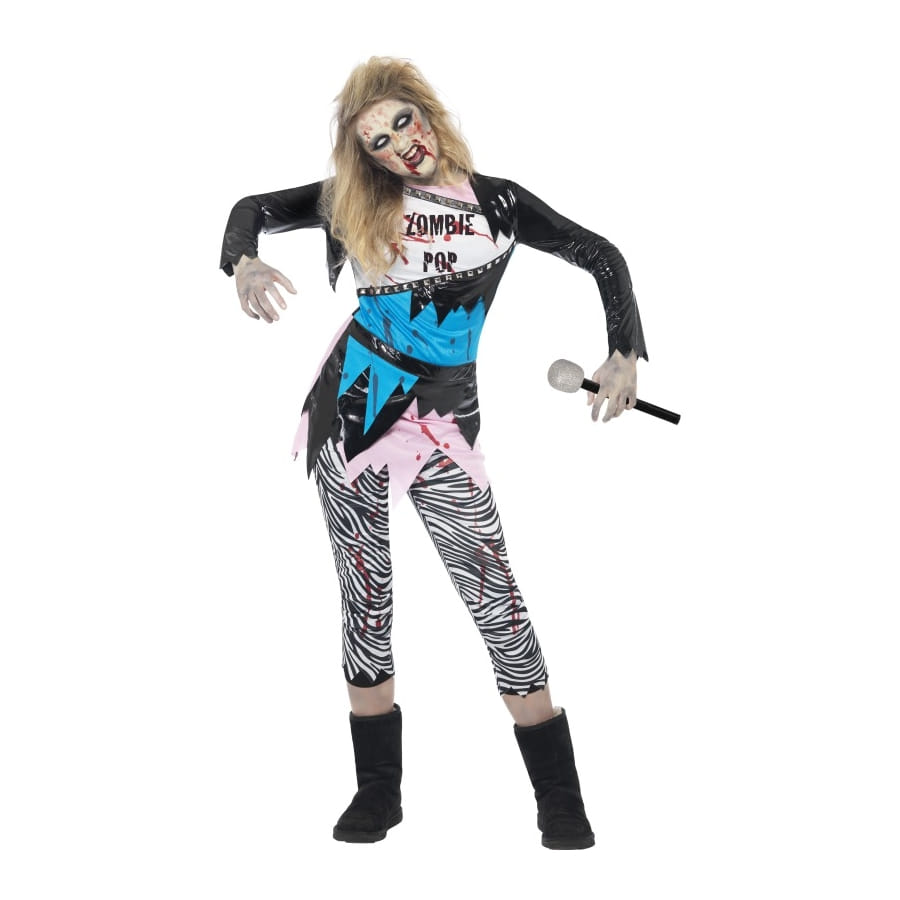 Déguisement de zombie Pop Star, pour fille, femme ou adolescente, composé d'une tunique et de leggings, tous deux disponibles en taille S, L ou T. La tunique est de couleur noire, blanche et bleue, avec le texte "Zombie Pop" inscrit dessus, tandis que les leggings sont zébrés. C'est un déguisement que les adolescents adoreront!