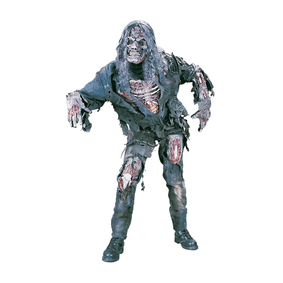 Set de déguisement de zombie 3D, pour homme ou femme, contenant une tunique déchirée, un pantalon et des gants assortis ainsi qu'un masque avec cheveux. Le déguisement entier est de couleur grise avec des os et de la chair qui apparaissent ici et là. Vous obtiendrez un effet horrifiant garanti!