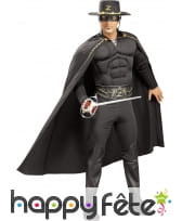 C'en est fini de l'injustice lorsque Zorro entre en action ! Apprêtez-vous à combattre les malfaiteurs dans votre déguisement de Zorro pour homme adulte. Vous disposerez d'un modèle sous licence Zorro, fabriqué dans un tissu noir épais à reflets satinés. L'article comporte un haut à manches longues et à col V. Le col se ferme à l'aide d'un lacet. Une belle cape noire liserée de doré accompagne le haut. Vous aurez également droit à un pantalon noir à taille élastique. La ceinture noire et dorée est à nouer dans le dos. Vous disposerez aussi de surbottes noires en feutrine liserées de doré sur le dessus. Elles remontent jusqu'aux mollets. Vous porterez aussi un chapeau en feutrine à bords larges, adapté à des tours de tête de 57 cm environ. Enfin, Zorro ne serait pas un justicier masqué sans son masque. Le vôtre sera de couleur noire, à nouer à l'arrière de la tête.