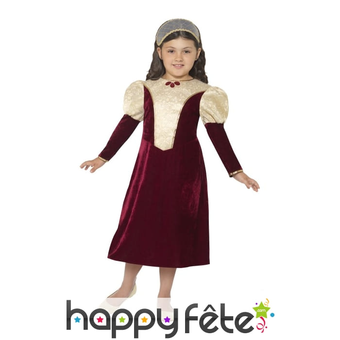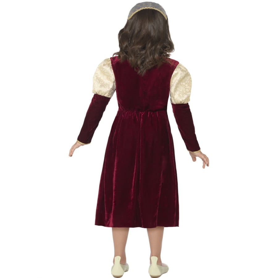 Ce déguisement demoiselle Tudor pour fillette arbore une magnifique couleur rouge bordeaux et beige. Il comprend une robe longue qui est faite dans un tissu à effet velours. Les manches sont longues, et bouffantes au niveau des épaules. La robe possède une belle finition dorée et le buste est orné de jolis motifs floraux. Une jolie coiffe en voile assortie à la robe vient compléter ce costume. Ce dernier est dédié aux petites filles. En ajoutant une jolie perruque, il fera une ravissante tenue de princesse complète pour votre petit bout de chou. Parfait pour une fête sur le thème Moyen Age, Conte de fée ou Historique...
