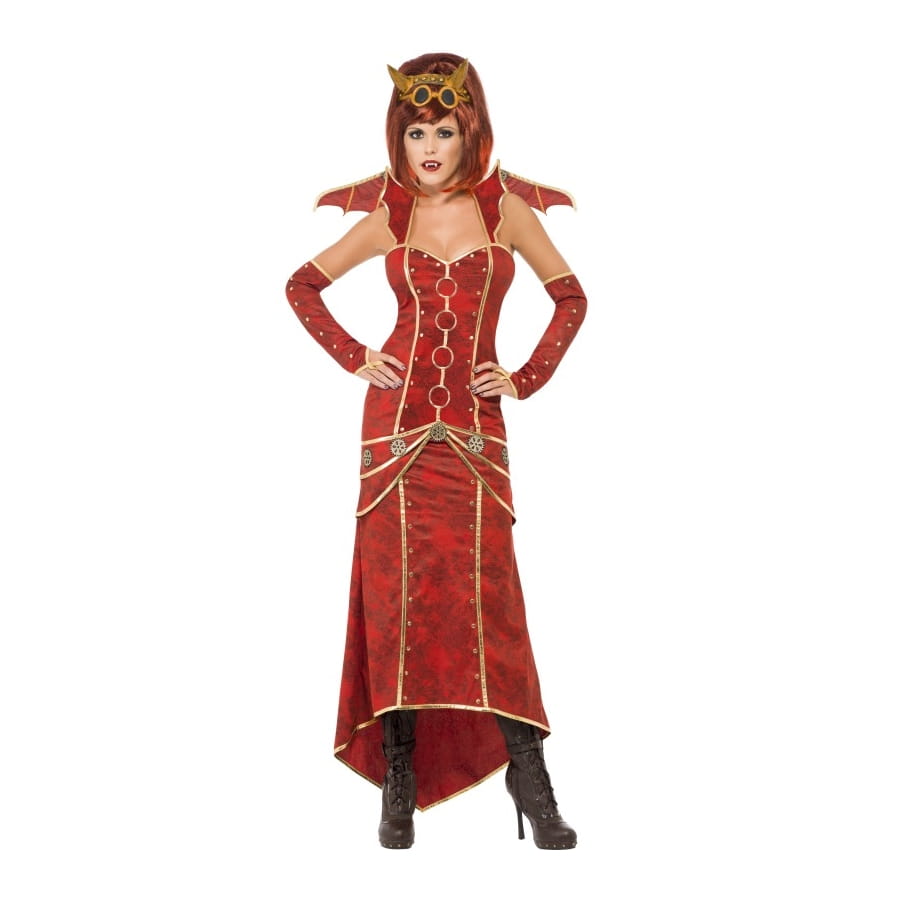 Un costume de diable steampunk est parfait si vous voulez être a la fois redoutable, effroyable et belle. Vous pourrez le porter pour Halloween ou une soirée horreur. Vous pourrez aussi le porter pour le carnaval. Cette robe sans manche est longue de couleur rouge et dorée, ce costume est aussi composé de gants de la même couleur, les gants dépasse le coude et une petite paire d'ailes.