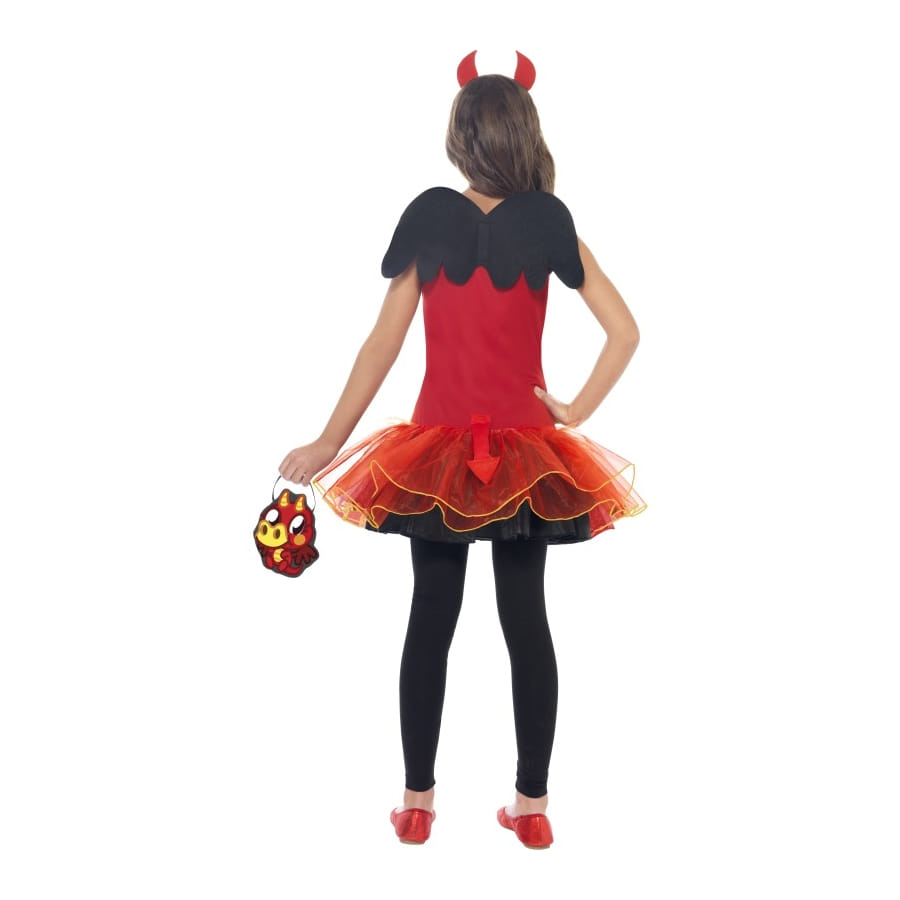 Déguisement de Diavlos de couleur rouge, jaune et noire, pour enfant, composé d'une robe tutu rouge avec un Diavlos imprimé dessus, d'une paire d'ailes, d'un serre-tête avec cornes et d'un petit sac rouge. La robe est disponible en taille S, M ou L. Pratiquez votre moonwalk pour devenir un vrai Diavlos!