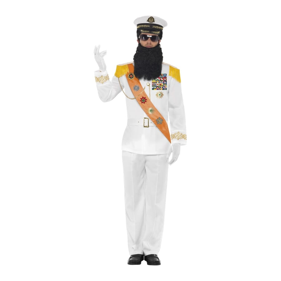 Vous connaissez sans doute "le Dictateur", fameux personnage grossier. Voici pour vous la réplique exacte de sa tenue! La pochette contient une veste avec ceinture attachée, une écharpe, un pantalon et un chapeau. Le tout est de couleur blanche, avec des touches de différentes couleurs ici-et-là. Vous pouvez également vous servir de cette ensemble pour un déguisement de soldat ou d'officier. Il est conseillé de nettoyer cette tenue à sec uniquement. La taille M correspond à une taille de poitrine de 96 - 101 cm et à un entrejambe de 83 cm