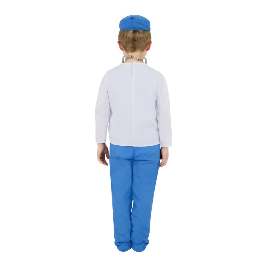 Déguisement de docteur de couleur bleue et blanche, pour enfant, composé d'un top, d'un pantalon, d'un chapeau, d'une veste, d'une paire de couvre-chaussures et d'un badge. Tous ces accessoires sont disponibles en taille S, M ou L au moment de la commande. Votre enfant aspire à devenir docteur? Offrez-lui donc ce déguisement!