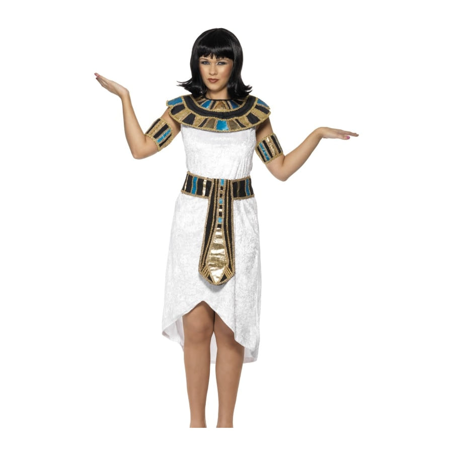 Un déguisement d’égyptienne qui est composé d'une robe de couleur blanche sans manche, elle arrive jusqu'aux genoux. Il est aussi composé d'un col doré, marron et bleu et de manchette. Vous pourrez porter ce déguisement égyptienne pour une fête sur l’Égypte. Tout le monde aura des yeux que pour vous.