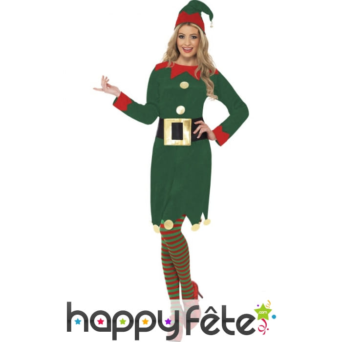 Ce déguisement d'elfe pour femme vous pourrez le porter pour incarner un lutin. Ce costume est composé d'un chapeau vert et rouge, d'une tunique manche longue de couleur vert et rouge avec clochette doré sur le bas de la robe ainsi qu'une ceinture noire avec boucle dorée.